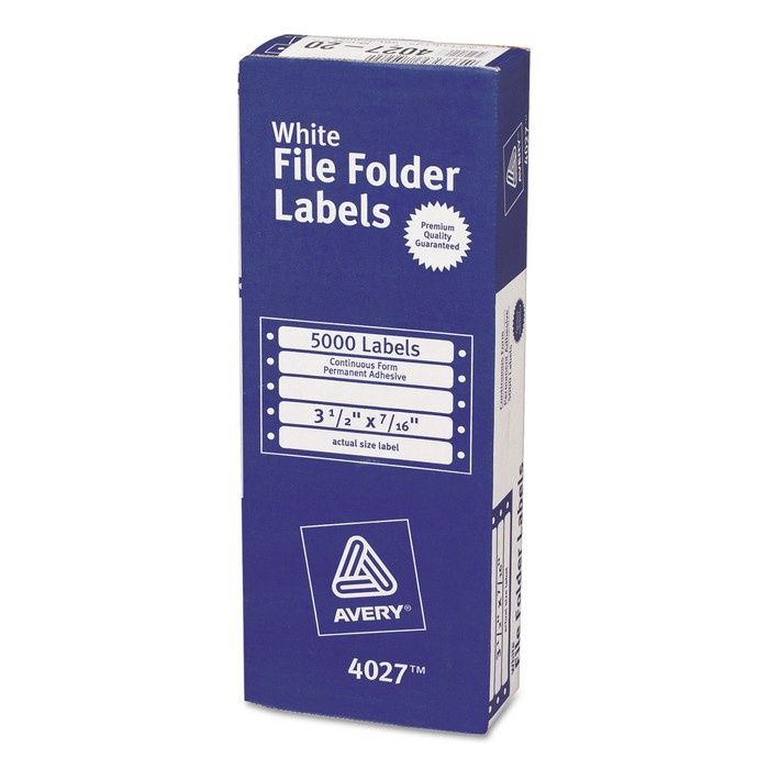 Avery Dot Matrix Printer Permanent File Folder Labels - Take the guessing games out of finding your files. Your file folder tabs are neatly identified and easy to read with these File Folder Labels. Each box contains a continuous form of labels suitable for printing in your pin-fed printer. These convenient labels are ideal for high-volume uses. Apply labels to the tabs of new folders for fast and efficient organization that lends a uniform look, or label previously used tabs to extend the life of your file folders. The labels' white background makes tabs easy to read at a glance so you can quickly locate the folder you need. Stop playing games and be a winner every time.