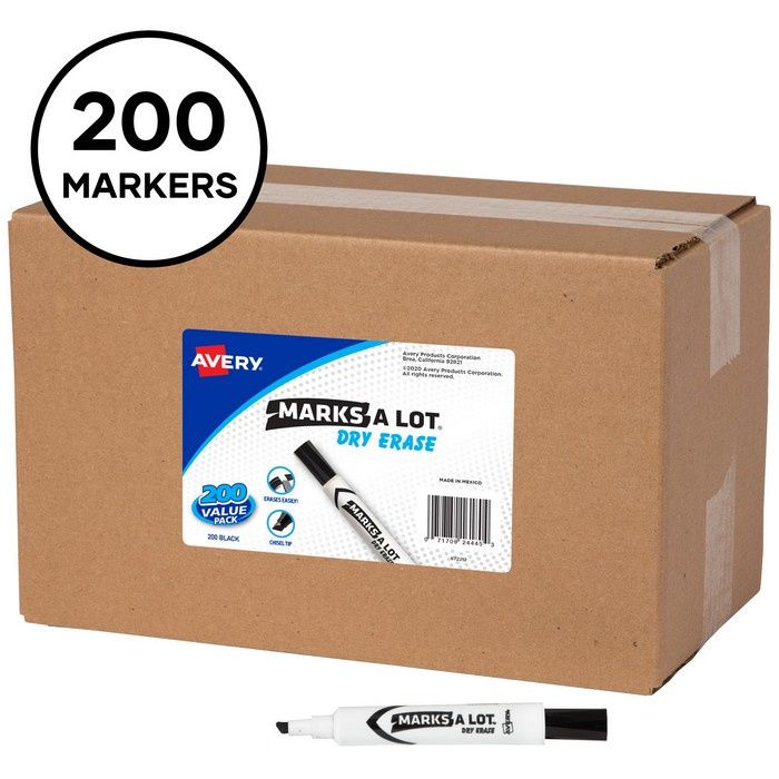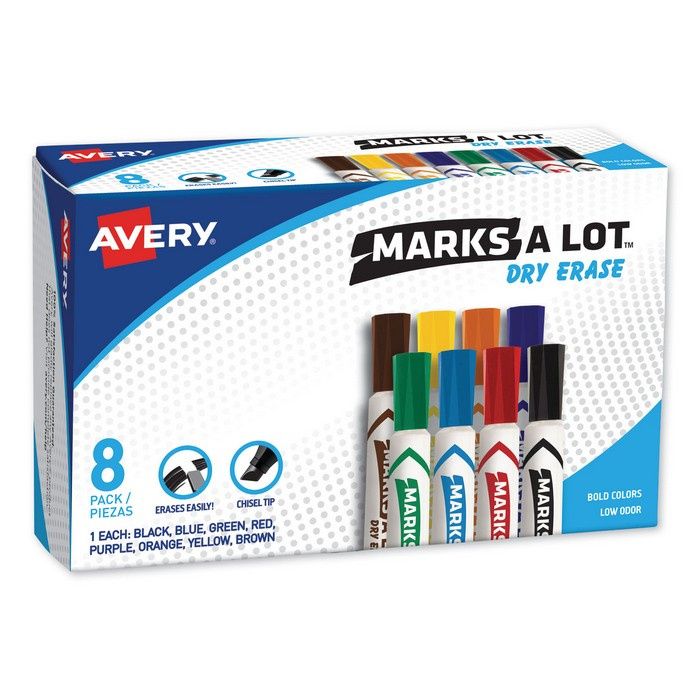 Avery MARKS A LOT Desk-Style Dry Erase Marker Ink is formulated to erase easily and cleanly. Improved color vibrancy and long-lasting writing. Marks on whiteboard, glass, and other nonporous surfaces. Durable chisel tip marks in a variety of widths. Cap can be left off for 24 hours without dry-out. Safe to use at home or school. Low odor, non-toxic. Marker Ink Type: Dry Erase; Marker Tip Type: Chisel; Marker Tip Size (text): Broad; Marker Tip Size (numeric): 4.8 mm.