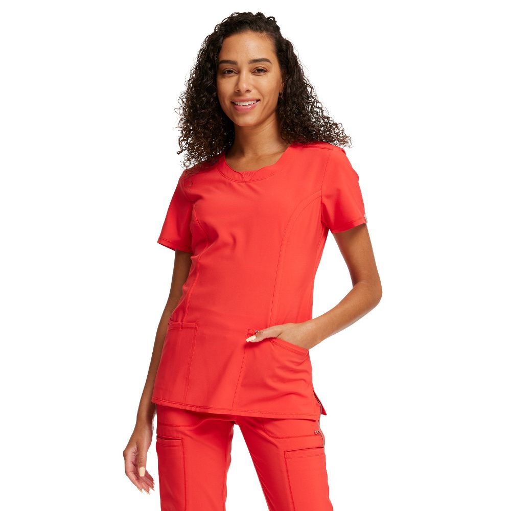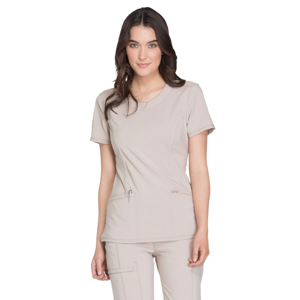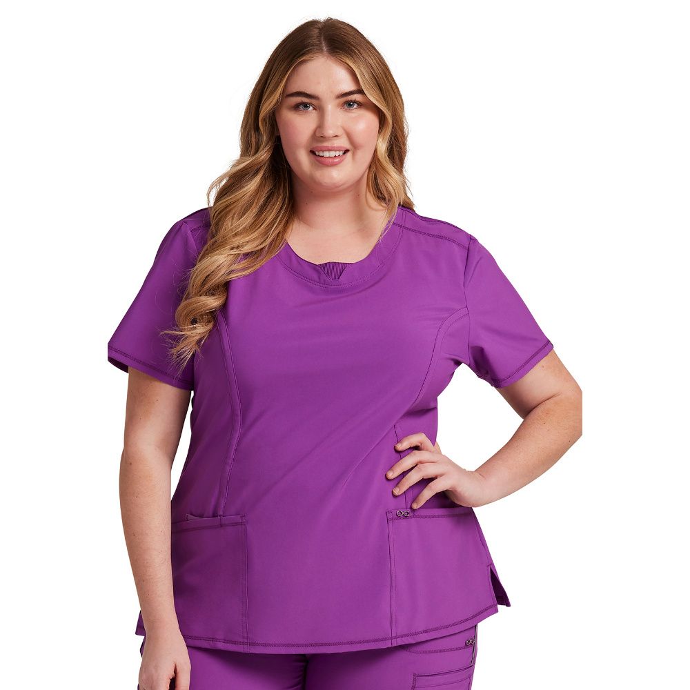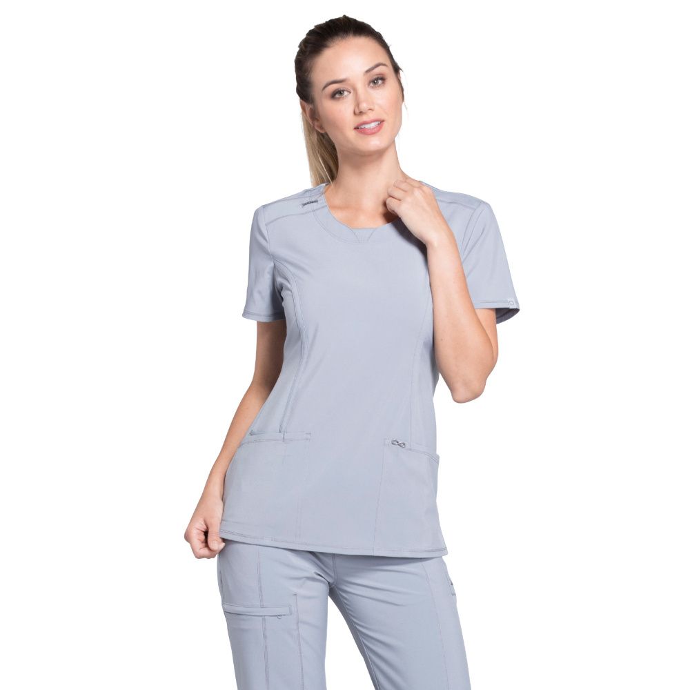 Cherokee Infinity Stretch Rib-Knit Back Panel Round Neck Top is a contemporary fit round neck top with a rib-knit inset at the front neckband also features shoulder yokes, a bungee ID badge loop on the right shoulder, front and back princess seams, two patch pockets, one interior pocket, and side vents. It has stretch rib-knit at the center back panel giving this top its slimming shape and allowing for extra movement and comfort.