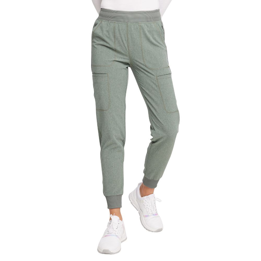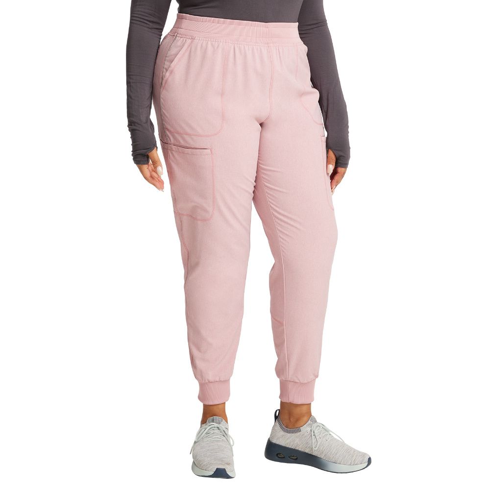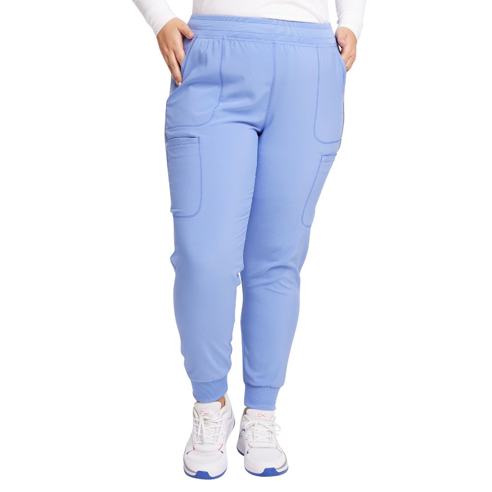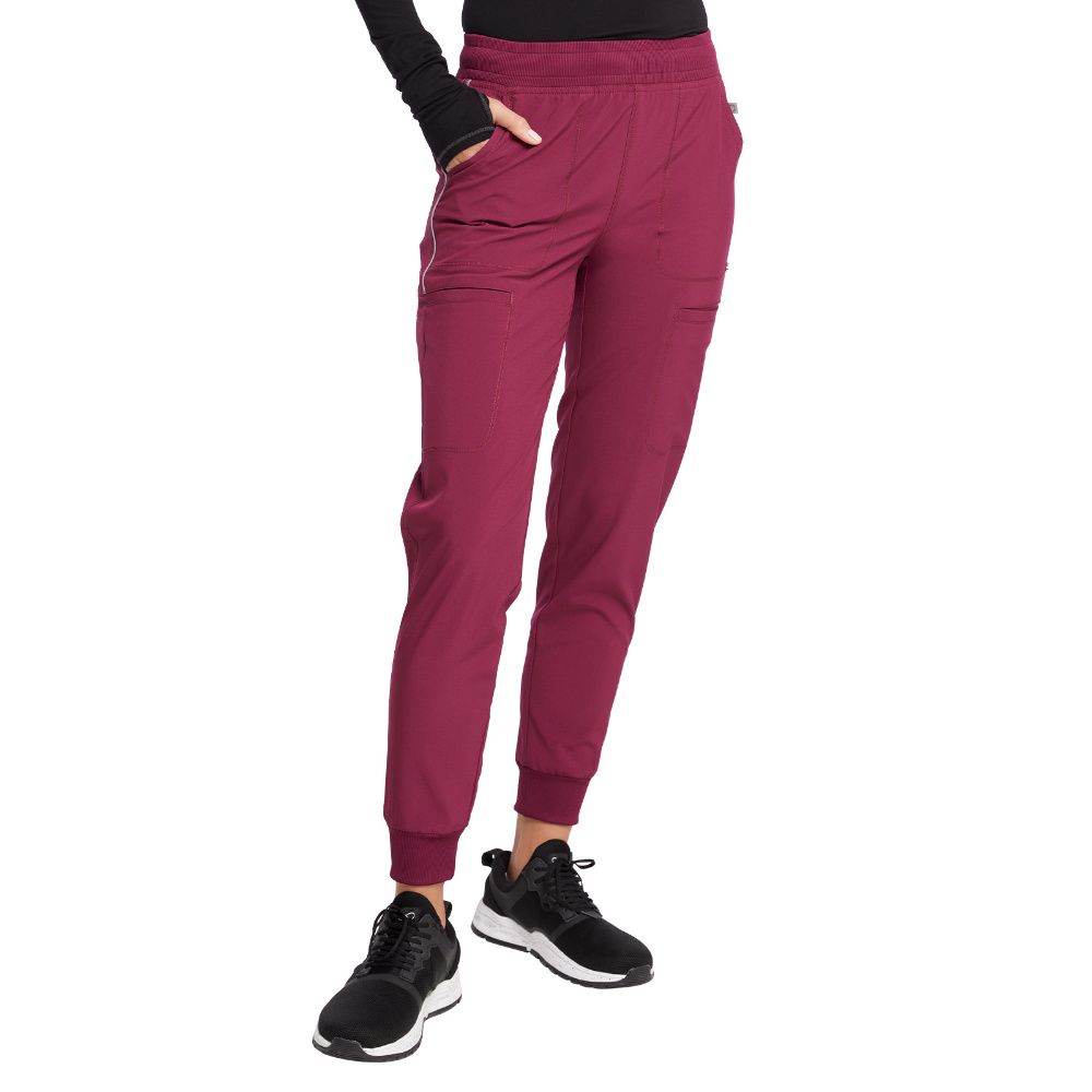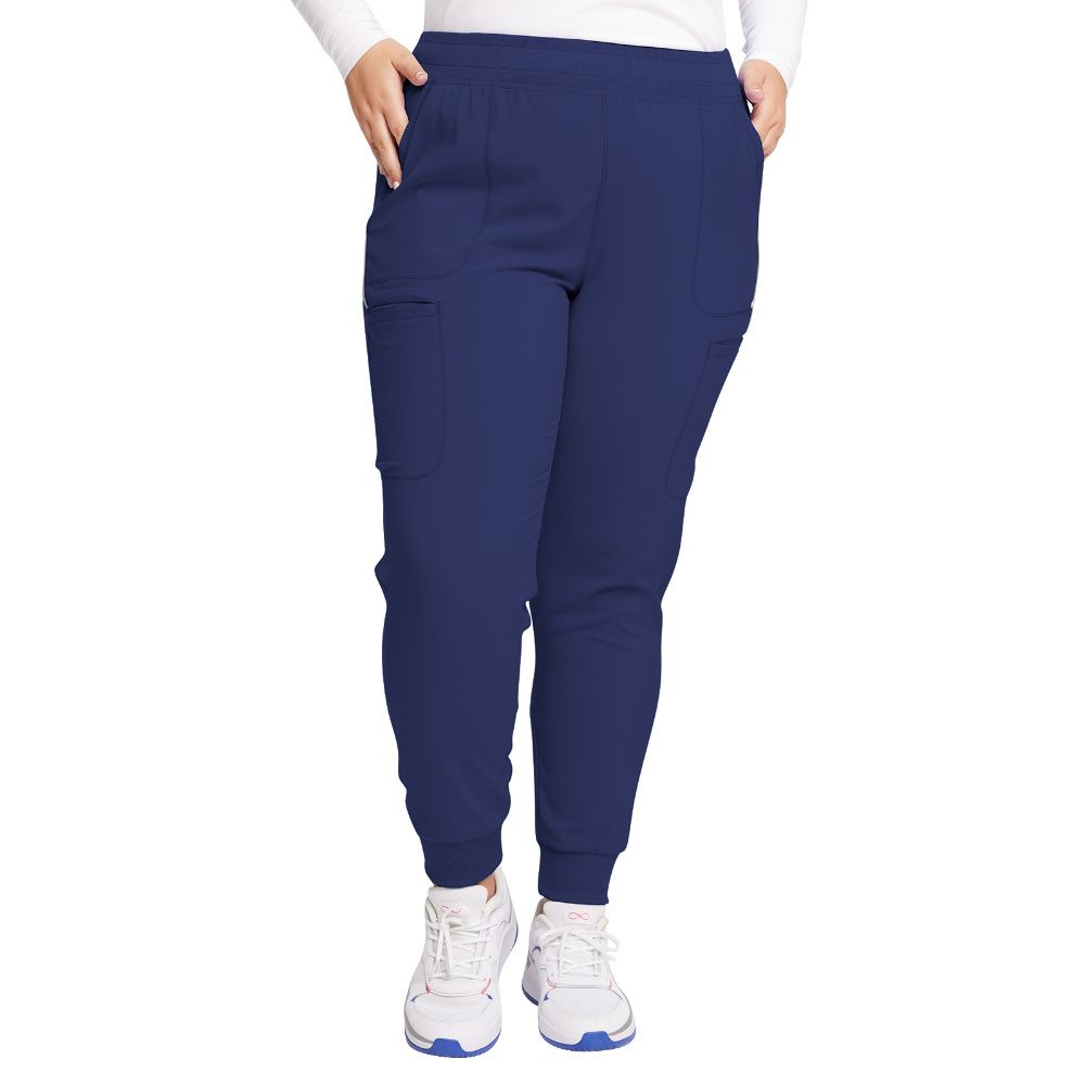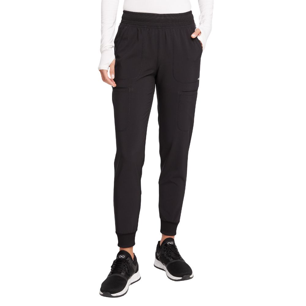Cherokee Infinity Women's Mid Rise Jogger has a rib-knit waistband with interior elastic and drawstring. There are six pockets: two front patch pockets, two cargo pockets, and two back welt zipper pockets. The jogger's leg is finished with rib-knit cuffs. Tapered leg, 9" opening. Inseam: 28 1/2".