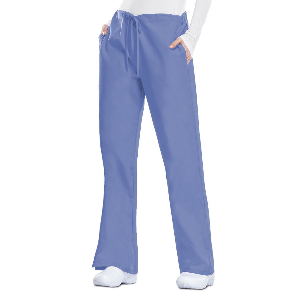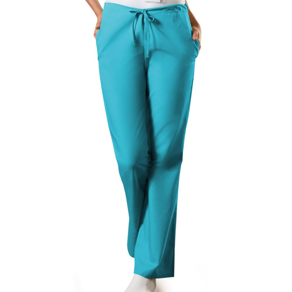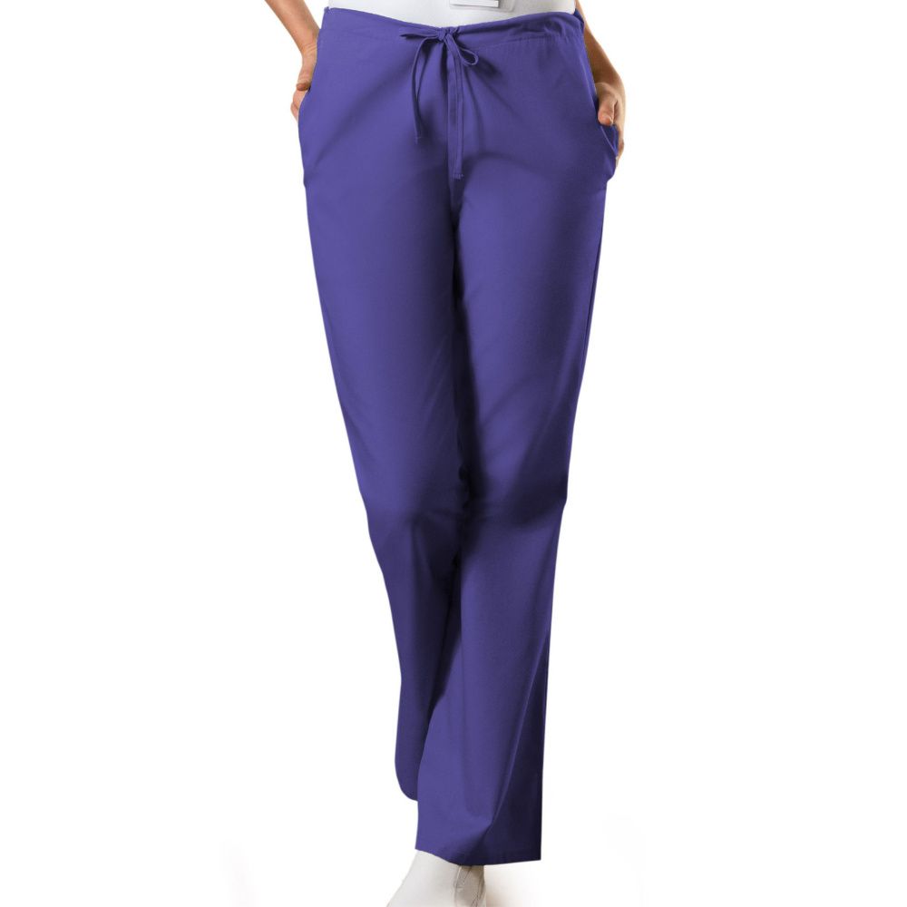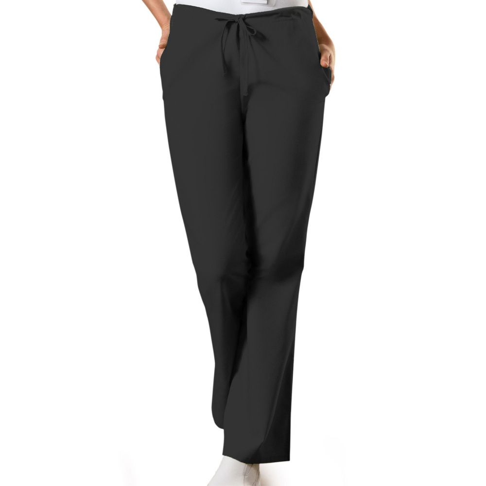 Cherokee Women's Natural Rise Flare Leg Drawstring Pant is a modern classic fit, natural rise, flare leg pant that includes side vents at the bottom, an adjustable front drawstring, a back elastic waist, front angled pockets, and one back patch pocket. The soft wrinkle-free fabric partners with a drawstring waist and back elastic to ensure a comfortable fit throughout your shift.