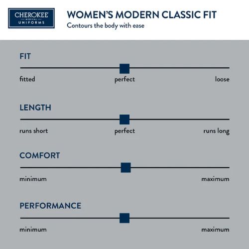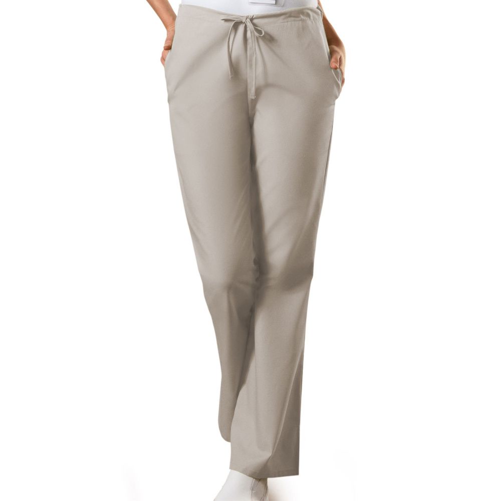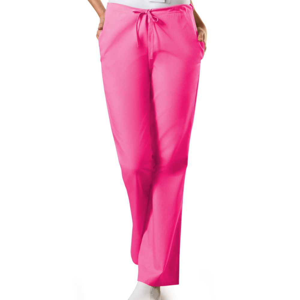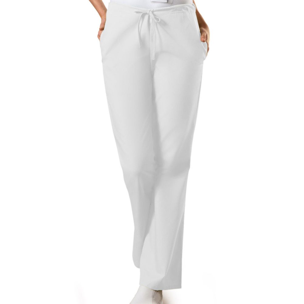 Cherokee Women's Natural Rise Flare Leg Drawstring Pant is a modern classic fit, natural rise, flare leg pant that includes side vents at the bottom, an adjustable front drawstring, a back elastic waist, front angled pockets, and one back patch pocket. The soft wrinkle-free fabric partners with a drawstring waist and back elastic to ensure a comfortable fit throughout your shift.