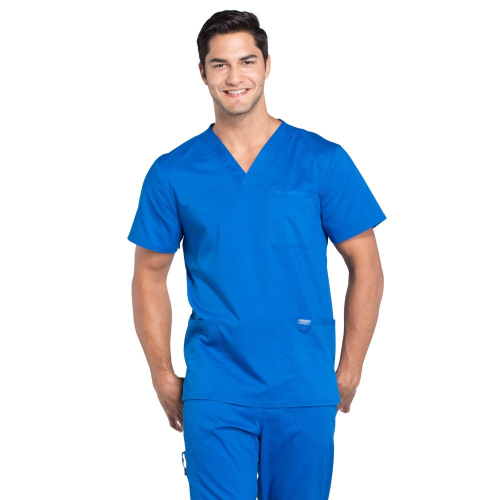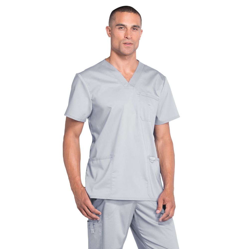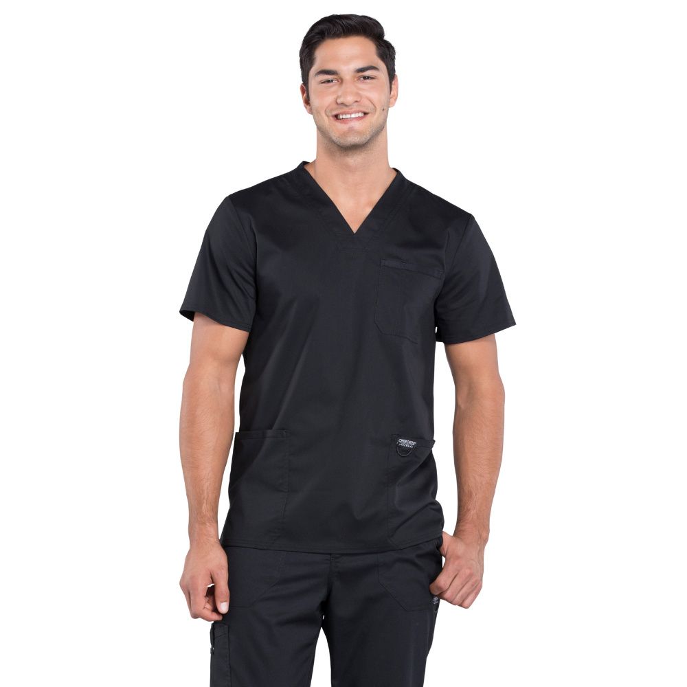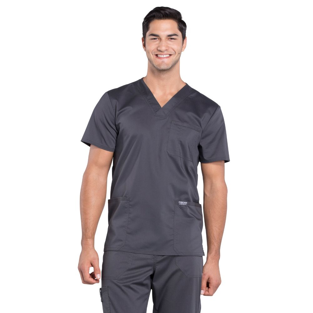 Cherokee Workwear Revolution Men's V-Neck Top includes a chest pocket with a pencil stitch, two patch pockets, a logo label with an I.D. loop, a back yoke, and side vents.
