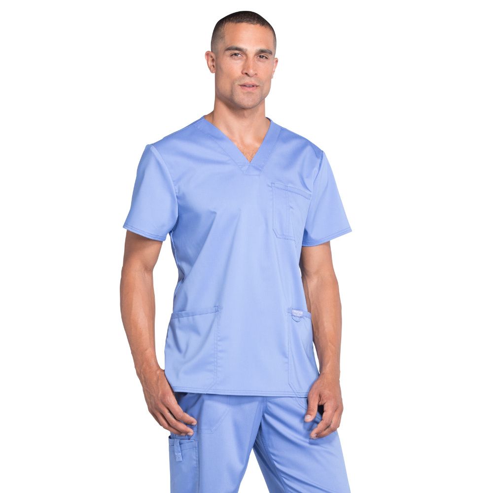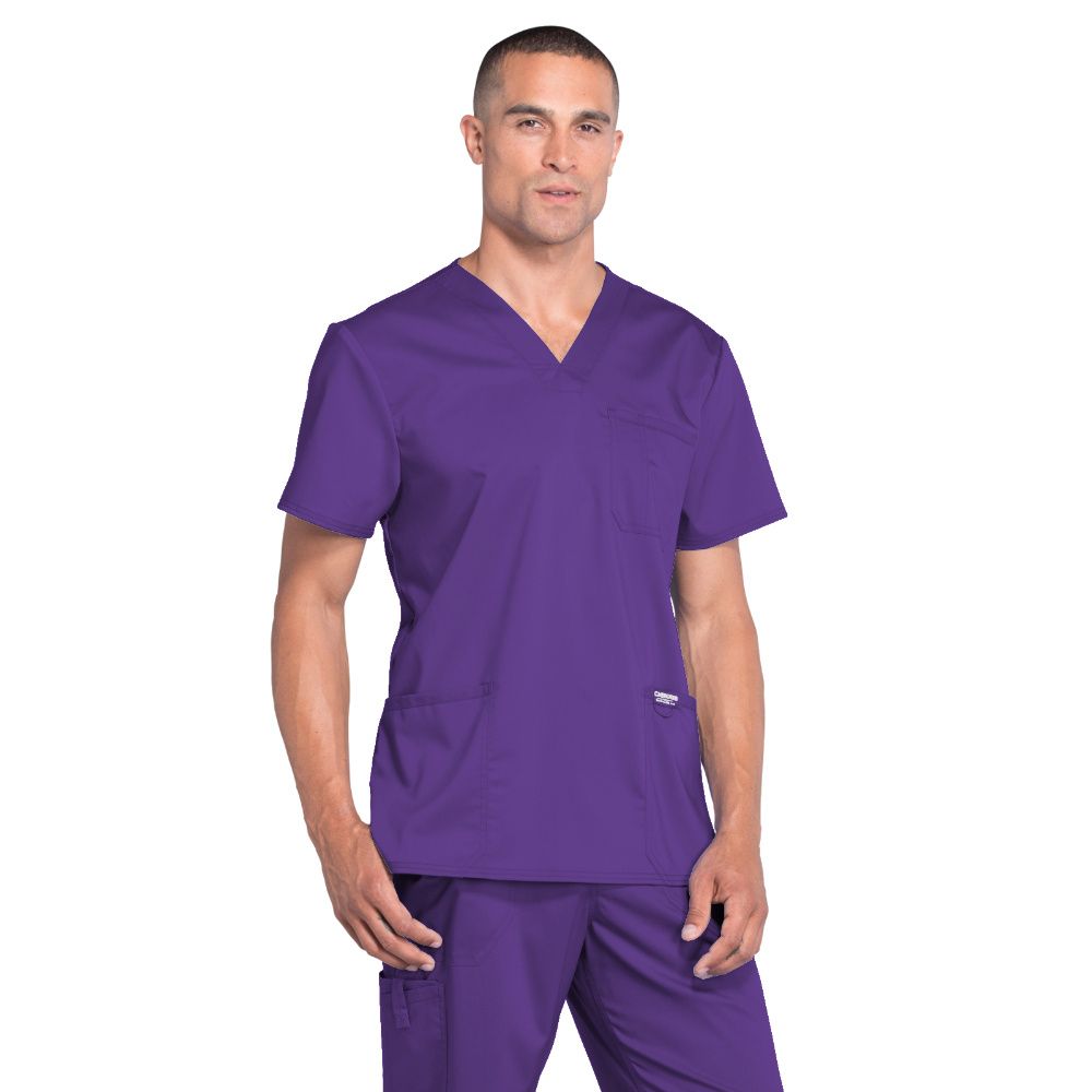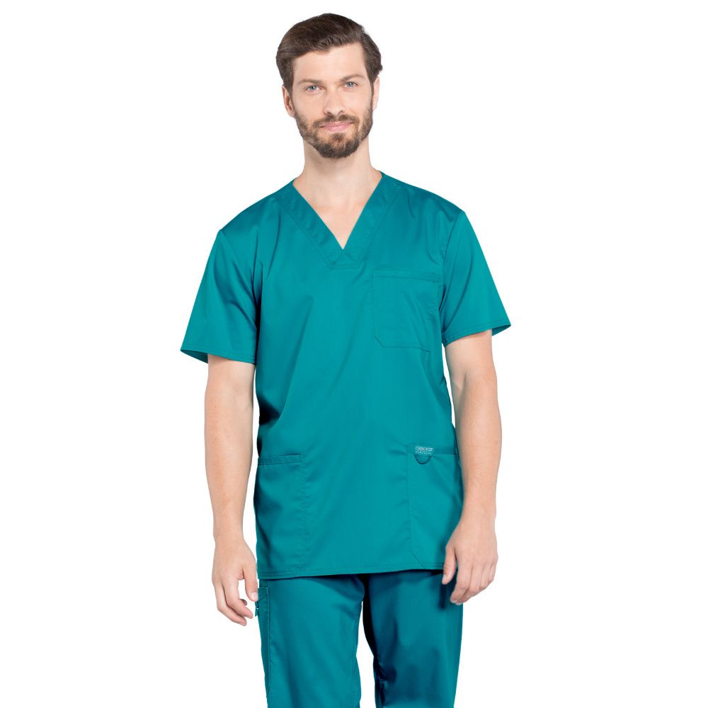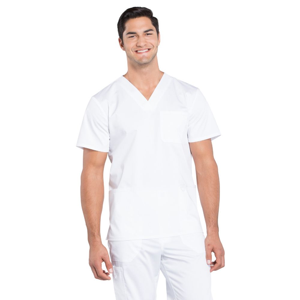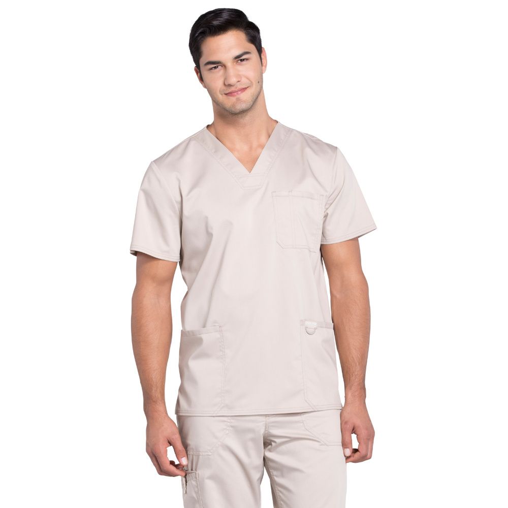 Cherokee Workwear Revolution Men's V-Neck Top includes a chest pocket with a pencil stitch, two patch pockets, a logo label with an I.D. loop, a back yoke, and side vents.