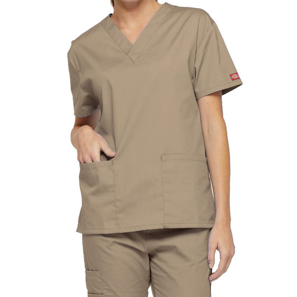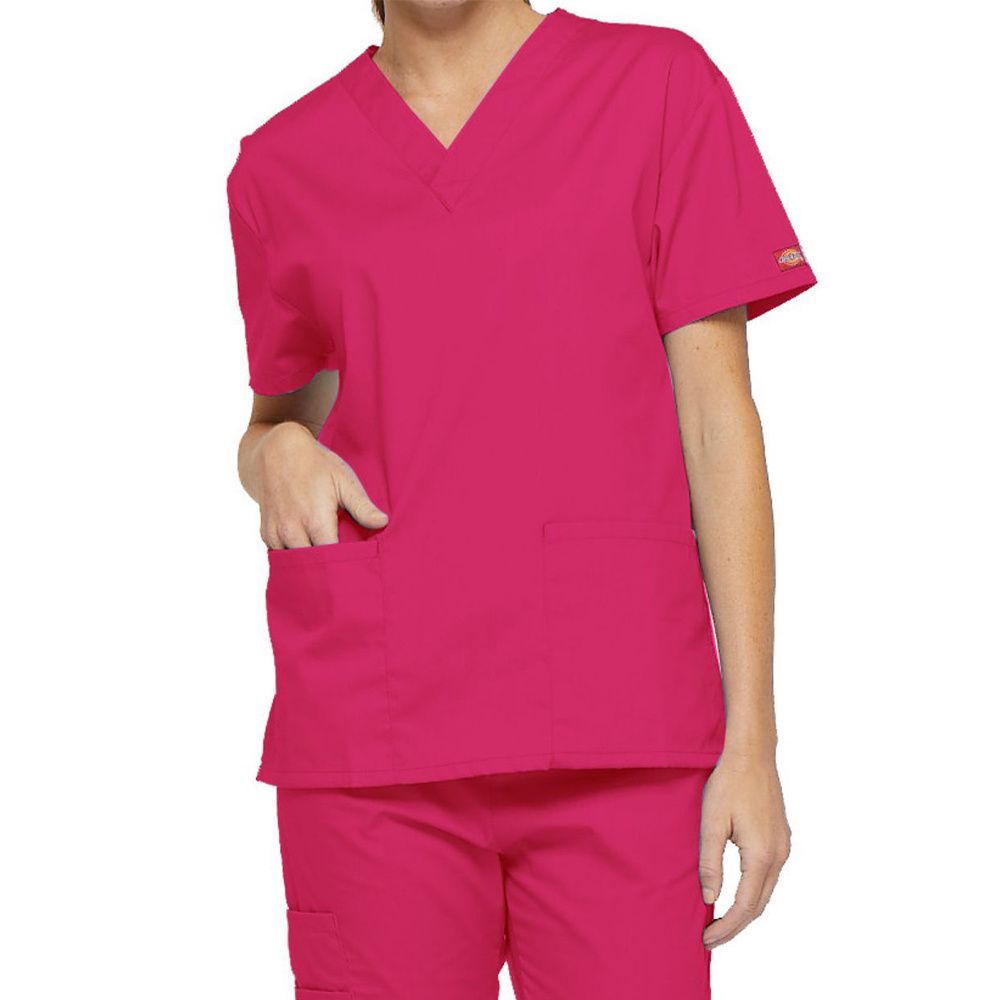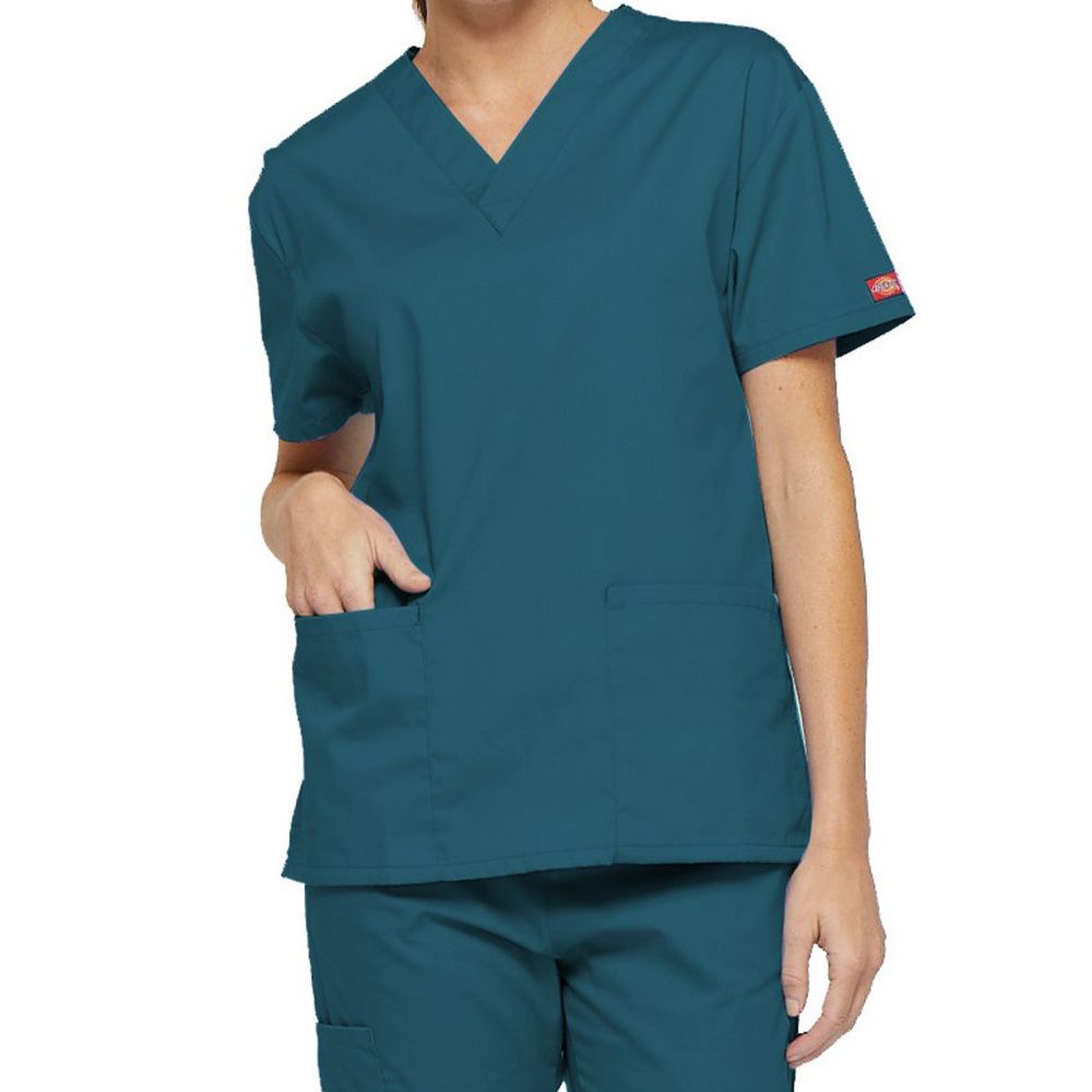 Dickies Women's V-Neck Solid Scrub Top is a modern classic fit, v-neck top featuring the Dickies logo twill tape at the back neck, patch pockets, a stretchy knit interior pocket, and side vents.