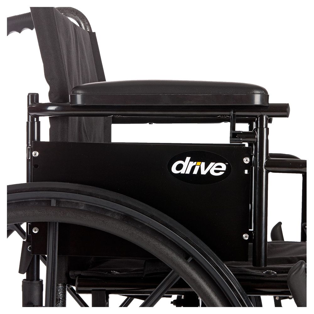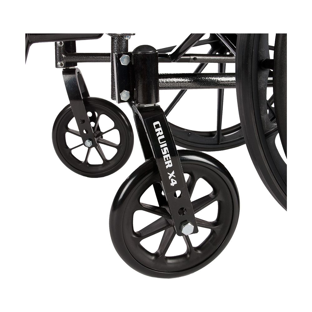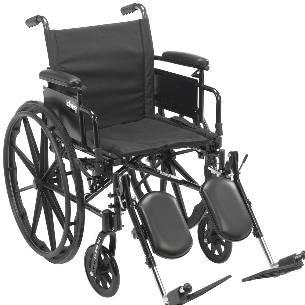 Drive Cruiser X4 Lightweight Dual-Axle Wheelchair With Elevating Legrests features frame style that eliminates seat guides and allows for custom backs and accessories. The flip-back, removable arm is height adjustable from top of seat rail 10 inches to 14 inches and features a front mounted easy to use lever release mechanism. It is easy to propel and transport. It weighs 34 pounds or less when properly equipped in the basic configuration (Excluding front rigging). The aluminum and carbon steel blended frame with combination powder coated and silver vein finish is attractive, chip resistant and easy to maintain.