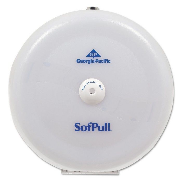 Georgia Pacific Professional SofPull High-Capacity Center-Pull Bathroom Tissue Dispenser - Put a smart new spin on bath tissue: one-sheet-at-a-time dispensing. High-capacity tissue solution helps reduce costs, while helping to improve hygiene. Translucent cover shows when a roll is ready to be changed and is made of polycarbonate for additional strength. Cover also hinges at the bottom for easy mounting and loading. Dispenser will fit your stall with single, side-by-side or stacked configurations.