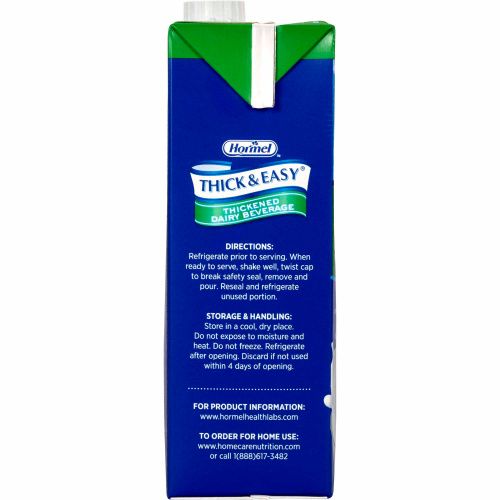 Hormel Food Thick & Easy Dairy Milk Flavored Thickened Drink is a reduced-fat thickened milk with a "real dairy" taste. It provides the same nutritional benefits as regular milk and is fortified with Vitamins A & D. It is packaged fresh to hold its great milk flavor.