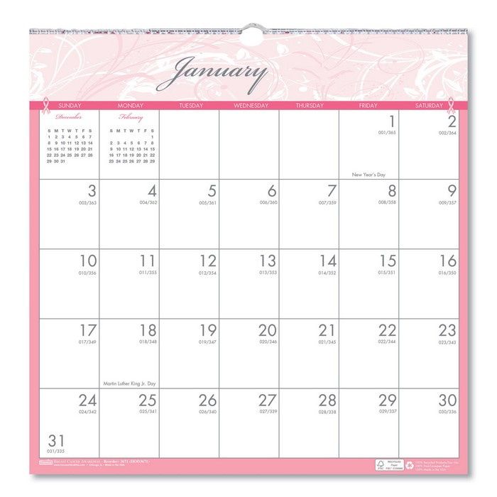 House of Doolittle Breast Cancer Awareness 100% Recycled Monthly Wall Calendar - Heighten awareness of breast cancer, and show your support with this pink and gray wall calendar. Large unruled daily blocks. Strong wire-binding firmly keeps the pages together and in place. Includes a sturdy wire loop to easily hang the calendar on a wall. Made entirely of recycled materials.