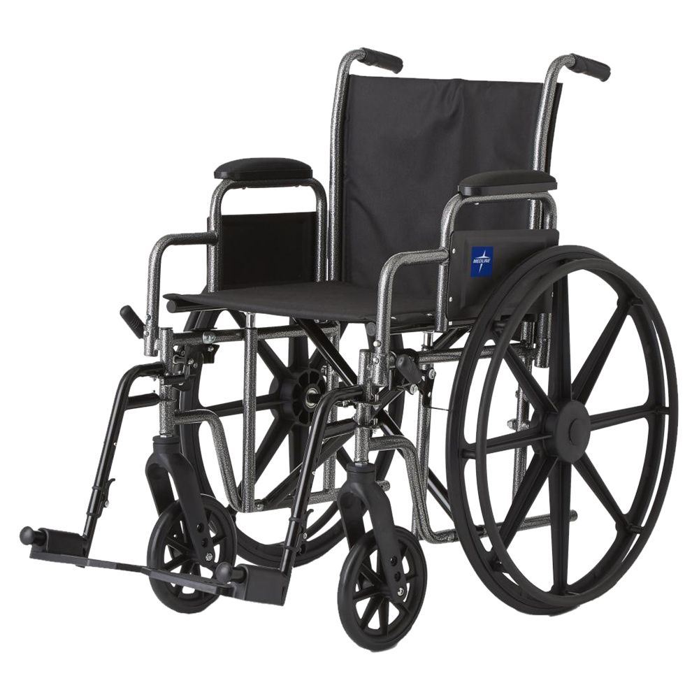 Medline K1 Basic Wheelchair is made of durable tig-welded frame in gray powder coat finish. The nylon upholstery offers a comfortable ride, along with the smooth-rolling, solid flat-free tires, which can handle most terrains. It includes elevating legrest models that feature a notched, stainless steel ratchet bar to lock the legrests securely in place.