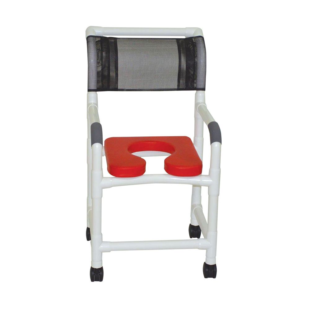 MJM 18'' High Backed Soft Seat Shower Chair is an extra comfortable shower seat with a 300 lb. weight capacity. This shower chair incorporates a luxurious soft seat and a high back for individuals who require additional back support. The 3"Â rust-proof threaded stem casters offer easy and smooth chair movement. The mesh back is removable, fast drying, flame resistant, mildew resistant, and features a high tear and tensile strength. All stress-related areas are reinforced to ensure safety, and the new push/pull handle facilitates easy patient movement and transfer.
