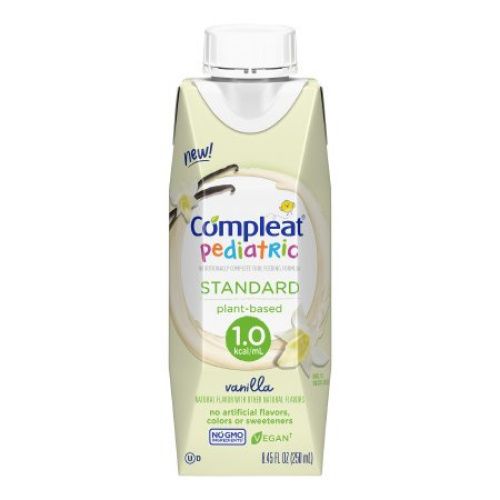 Nestle Healthcare Compleat Pediatric Standard 1.0 Cal Oral Supplement is plant-based and vegan. It contains soluble and insoluble fibers to support digestive health and normal bowel function. It is a nutritionally complete vanilla-flavored formula for dual use as tube feeding or a delicious oral nutritional supplement.