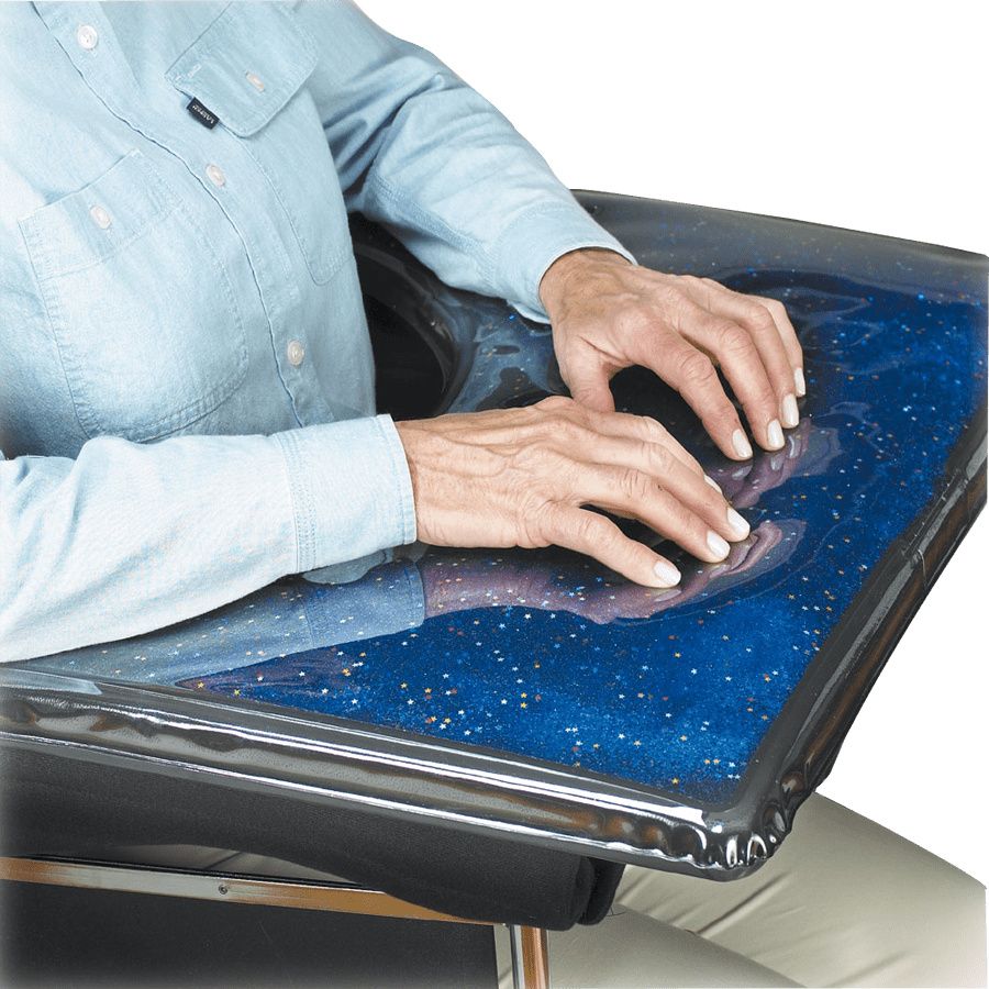 Skil-Care Gel Top Sensory Stimulation Tray provides both tactile and visual stimulation to reduce agitation and restlessness on the part of wheelchair-bound Alzheimers and other diminished capacity patients. It also reduces pressure on arms and elbows when the patient uses the tray for postural support and positioning. The water-based gel surface provides tactile stimulation while bright stars in water-based gel calm agitated residents.