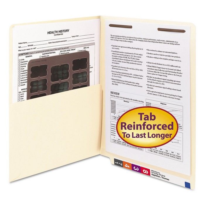 Smead Heavyweight Manila End Tab Pocket Folders with Fastener The handy pocket on the inside panel holds small or loose materials safely. Pocket stores small objects or items that cannot be two-hole punched. Bonded fasteners hold papers securely. Heavyweight material for extra durability. Reinforced tabs for longer life. Labels sold separately. This product was made using wood sourced from a certified managed forest. File Folder Size Type: Letter; File Folder Color: Manila; Color Family: Manila; File Folder Material: 11-pt Manila.
