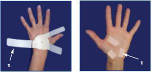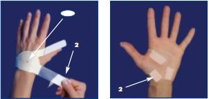 Step 1: Attach the first strap below the little finger securing it on the palm just above where the palm meets the wrist. Cut with scissors or tear away excess tape to prevent overlap. Care should be taken not to damage the strap if you tear away the excess tape.
